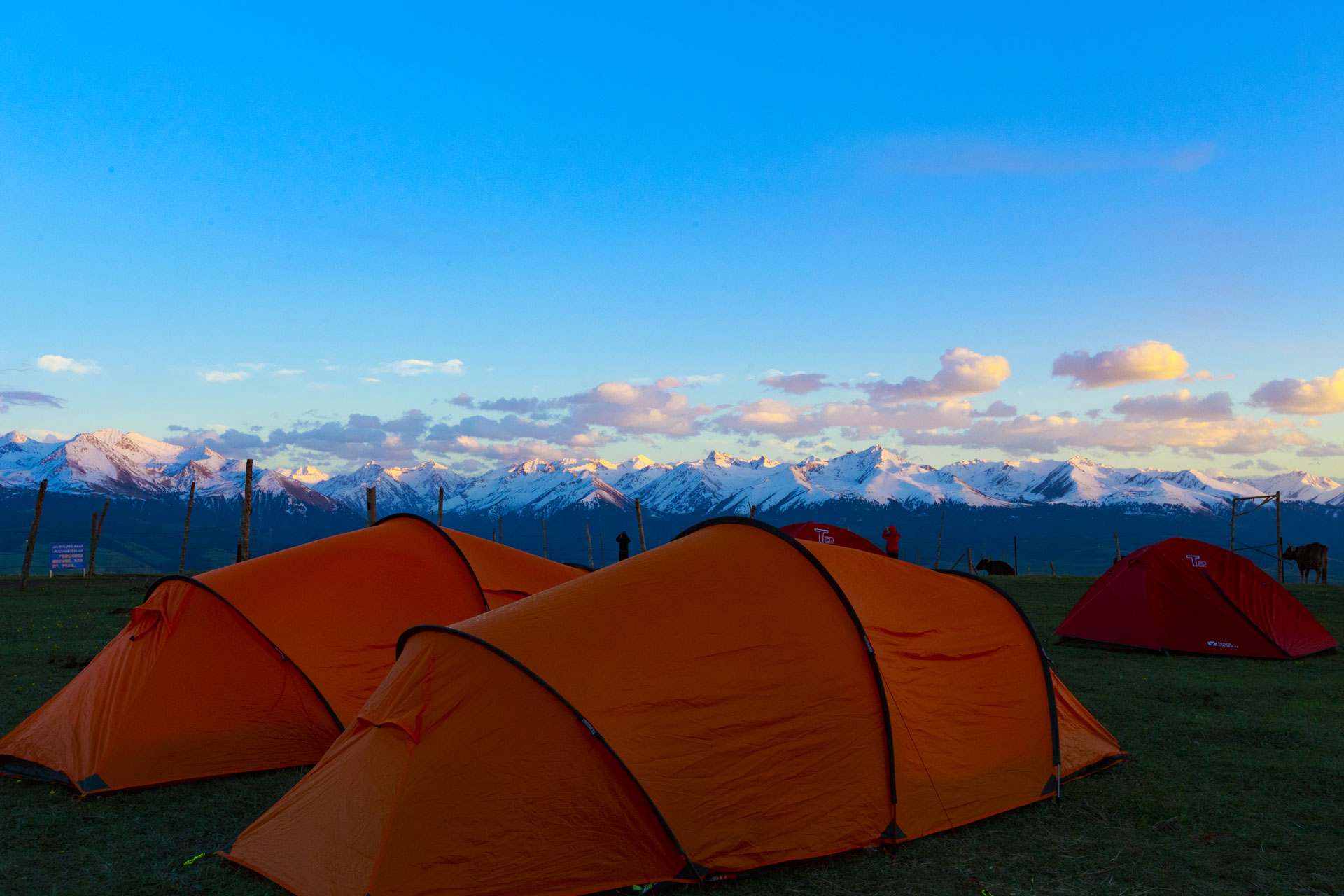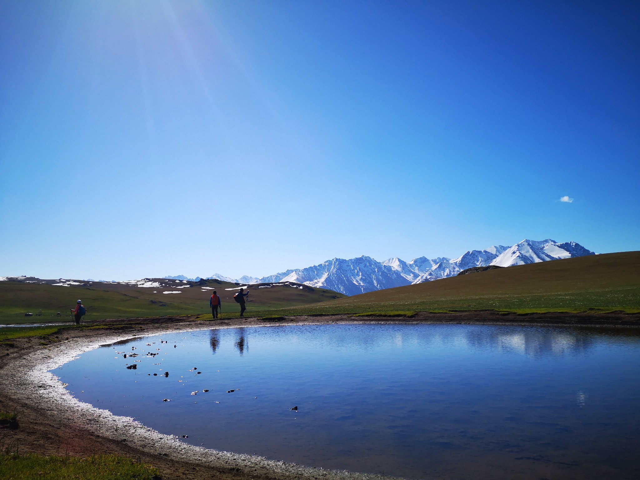 “螳螂捕蝉黄雀在后”,格桑在给他们拍合照,而我在后面记录下这一刻。连成一线的 天山 山脉很美,原来再美的景也需要有人物的存在才更美。