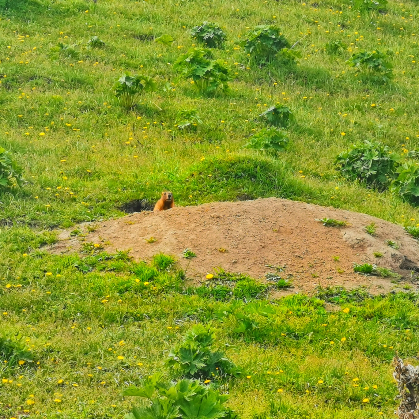 渐入莫乎尔草原,视野又变得开阔起来。骑着摩托的牧民上山来放牧,身边还有一条雪白的小狗作伴。经过我们的时候,打量着我们一群人。