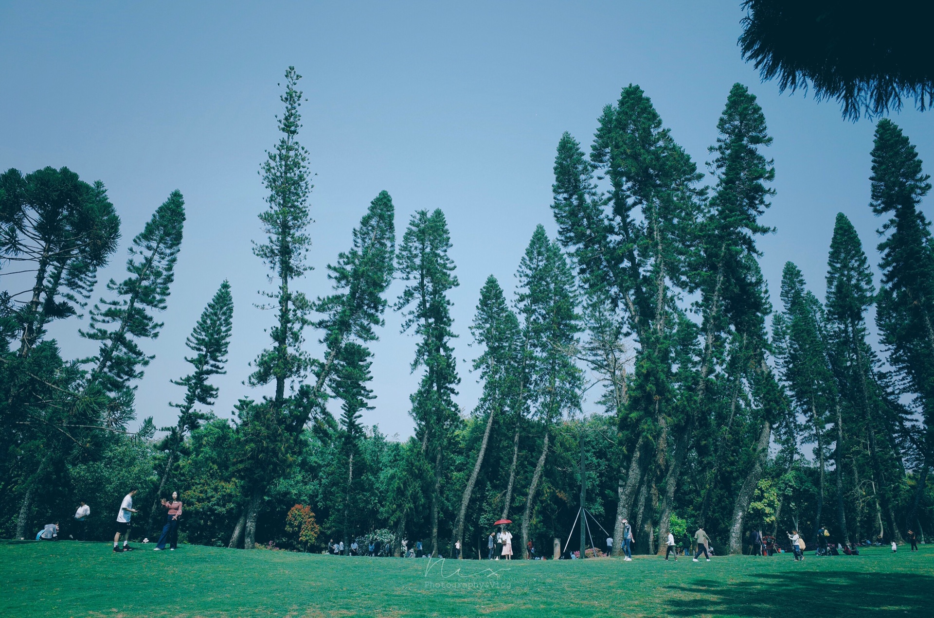 入园便是这片松杉草坪。成片弯耸入云的松杉,是一番奇异的壮观。