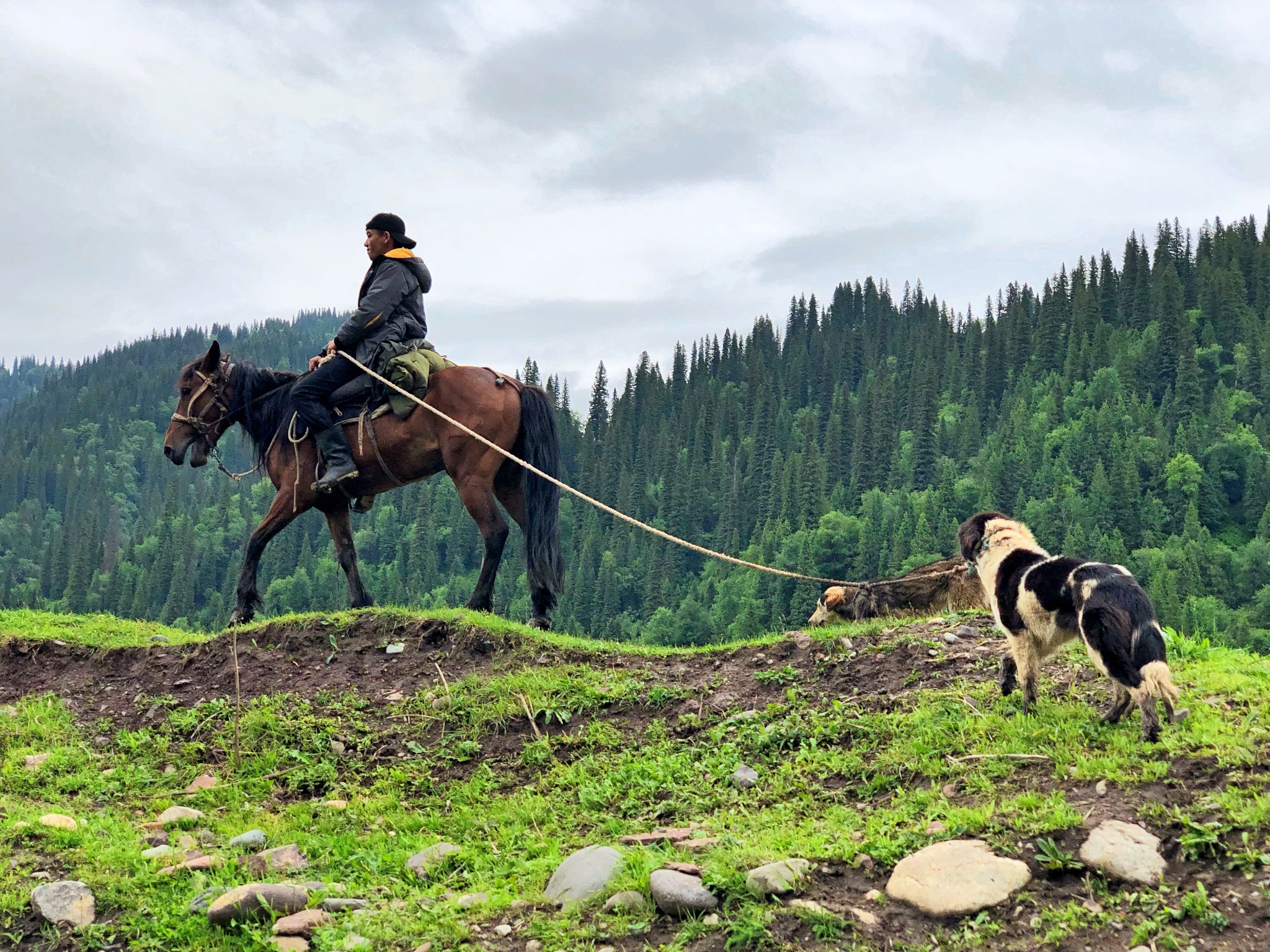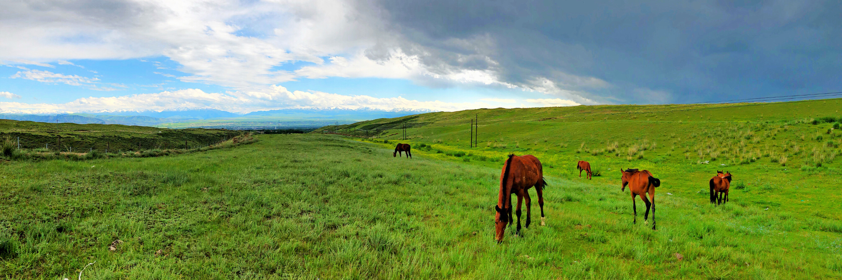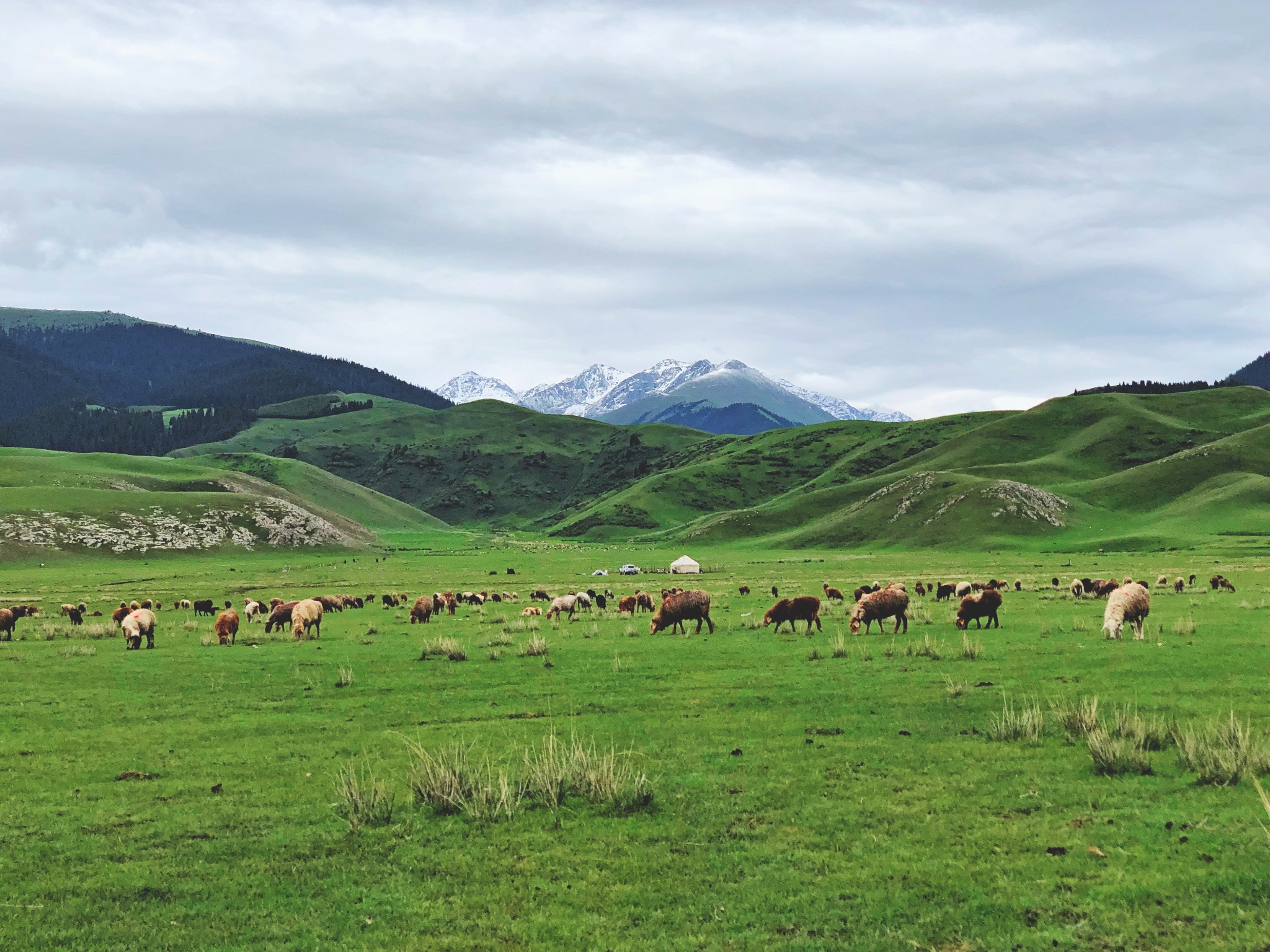 野性的玩法带来野性的收获。 车子开到夏塔景区,却没有了进去游玩的兴致,于是在客户服务中心干掉四碗泡面之后,上车,沿着212省道继续往前开。和我去边境线走一走?最终发现边境线并不是一条线,甚至连界碑也没有开到,横亘在眼前的军事禁区使我们不得不折返。不过没关系,我们已经是当天距离 哈萨克斯坦 最近的游客了。 返回路上: “这附近有个 天山 绿湖,要不要去?” “可以啊。” “不过我们的车子好像开不进去唉,底盘太低了。” “没关系,那就往前开,开到哪算哪。” “同意!” 于是,车子从一条小路插了进去,沿着坑坑洼洼的路摸索着开,终于被挡在了某一个节点。而此时我们却被眼前的景色惊呆了——一片好大的天然草场! 绿色从我们脚下展开,铺满整个草原,爬上 天山 山脉,在尽头与雪山、与天空交汇。大片的羊群是这里的主角,吃草的姿态是如此优雅,咩咩的叫声中流露出放肆。牧羊的老人歪躺在山坡上,马儿在一旁吃草,悠然自得。 苍穹之下,万物皆有序。自然界间的生命按照自己的规律法则轮回延续,谓之和谐。可能眼前的牧羊老人依然遵循着日出而作、日落而息的生活习惯,甚至无法用定义性的文字总结出他的生活状态,但他正是这份难能可贵的和谐最大的缔造者啊!或许陶渊明笔下的桃花源所要表达的正是此刻我们眼前的景象吧。 我们尝试着和老人交流,果然陷入双方互相听不懂的状态,只剩下微笑这份表达善意的最后的名片。“在草原上策马奔腾”是小时候看《还珠格格》留下的“后遗症”,一番肢体语言沟通之后,我们四人借用了老人的马,希望像古装偶像剧中的男女主角一样,在马背上依然英姿飒爽。 老人又歪躺在山坡上。 骑马的过程无需多描述,现实毕竟是现实,玩得爽就够了!我们当中,Amy小姐姐有过骑马经历,所以驾驭起来轻车熟路,姿势帅得很,希望这份夸赞可以让她忘掉三天前的“湖边、星空”。 把马儿还给老人之后,四个人爬上山坡,开始“放飞自我”。举目四望,我们是仅有的“入侵者”,这片野草原,我们,今天,承包了!