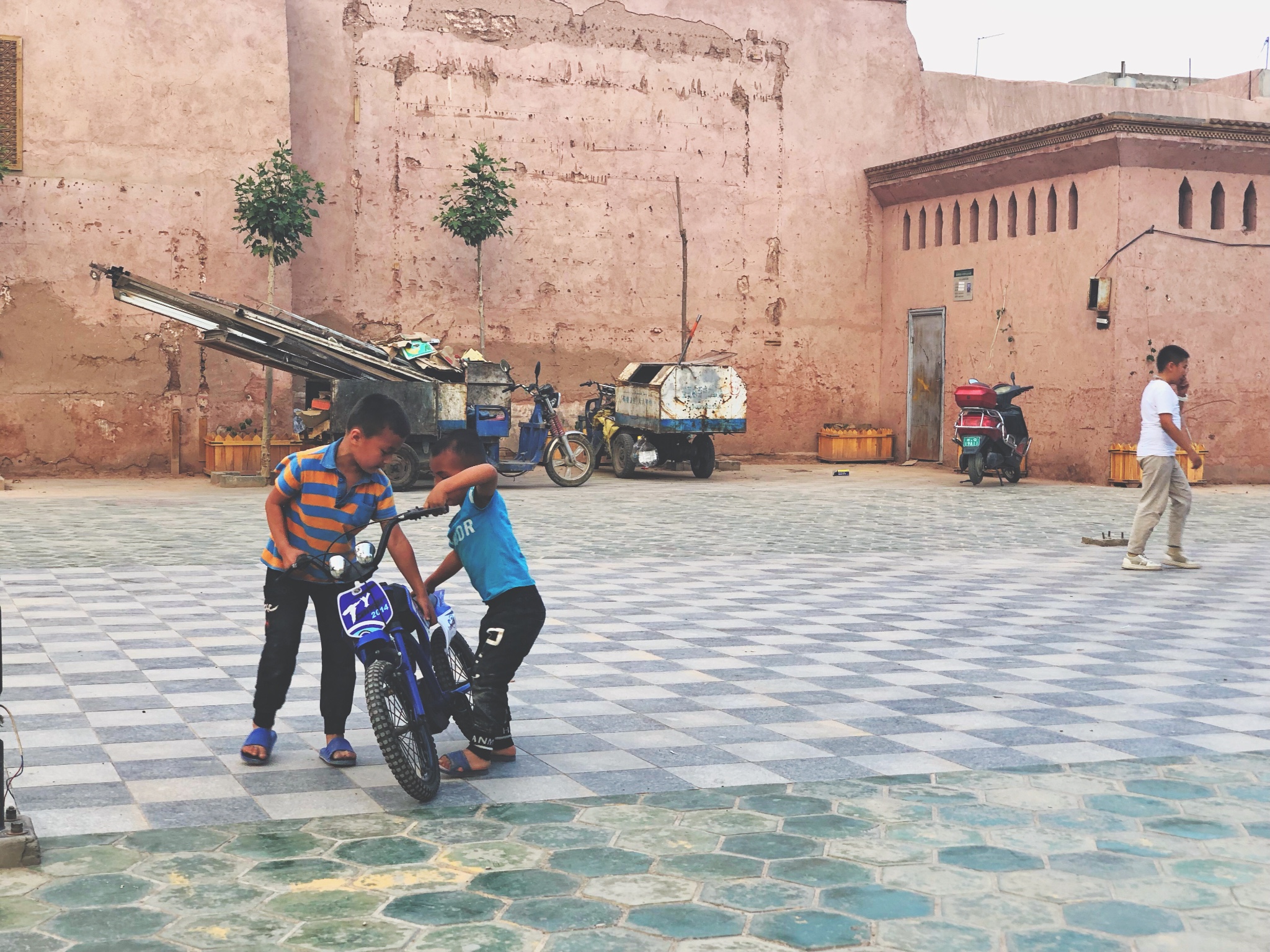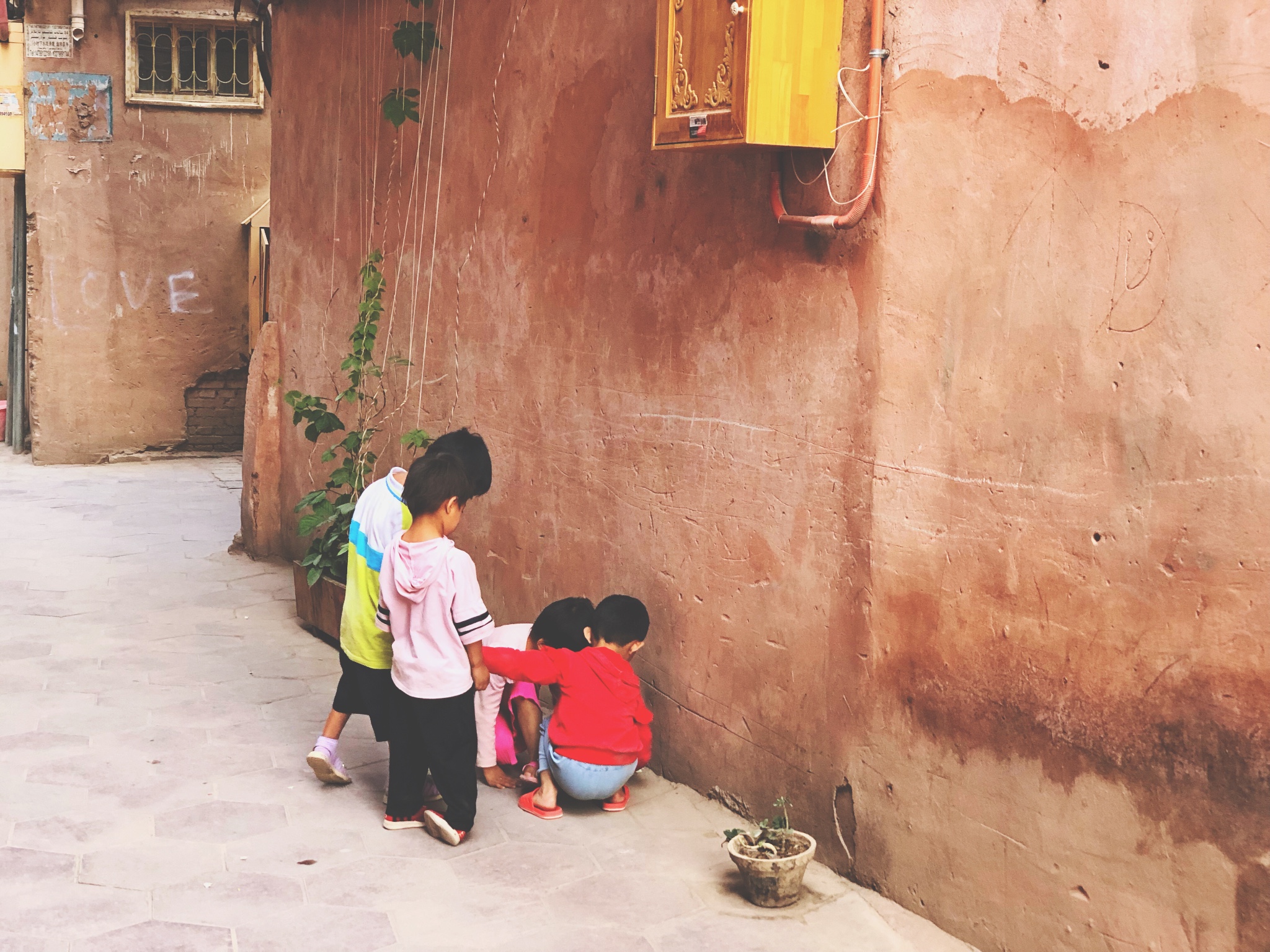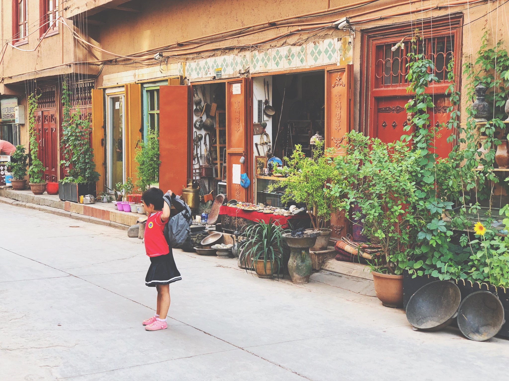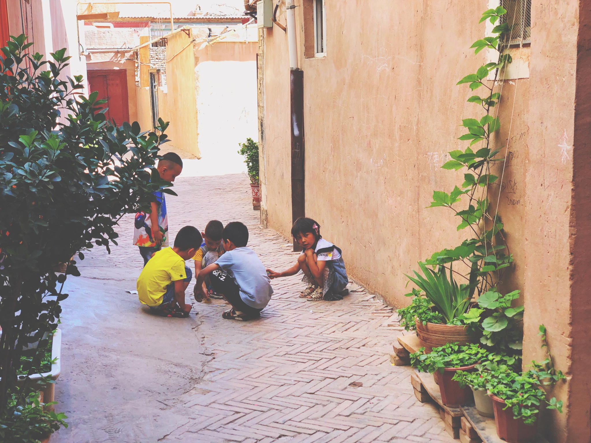 近几年的游玩经历中,确实去过一些“古镇”、“老城”。然而,有的“古镇”已经被翻修得没有了“古味”,与其说是古镇,不如说是走复古风的“ 新城 ”;有的“老城”确实存在了千百年,然而在各种“舶来品”的冲击下,商业化日趋严重,逐渐失去了原有的味道。但 喀什 老城不同,在我看来,这里的“卖点”并不只是它的“异域风情”,更是它尚未被外界过分打扰的生活状态。 黄土墙、花砖路、曲折迂回的巷子。历经风雨沧桑,这里依然保留着最朴素的面貌;烤馕店,老茶馆,各式各样的巴扎和作坊。千百年来,这里依然讲述着生活最珍贵的朴实 和平 静。 “余忆童稚时,能张目对日,明察秋毫,见藐小之物必细查其纹理,故时有物外之趣。”——《童趣》沈复 走在 喀什 老城,时不时有小朋友冲到面前对着我们大喊“你好”,这也许是他们汉语词汇量的极限。放了学的孩子们聚在一起游戏,没有手机也没有iPad;“坐在路边晒太阳”是这里生活的日常;三五好友,喝茶聊天,悠然自得。坐在广场上,看着眼前的一幕幕,思绪回旋。仿佛又看见了多年前阳光下互相踩影子的那群孩子;夏夜,侃大山的声音混着蝉鸣从巷口传来;哦对,我家的小白猫顺着香气溜到邻居家的院子,偷吃掉了一整盘黄瓜炒鸡蛋,这已经不是第一次了。 在一个不知名的巷口,被烤串的香气勾住了脚步。卖烤串的老爷爷颤巍巍地掏出身份证,指着出生日期那栏的“1940”,似乎是在告诉我们,时光的车轮滚滚向前,而这里依然保留着它原本的样子。