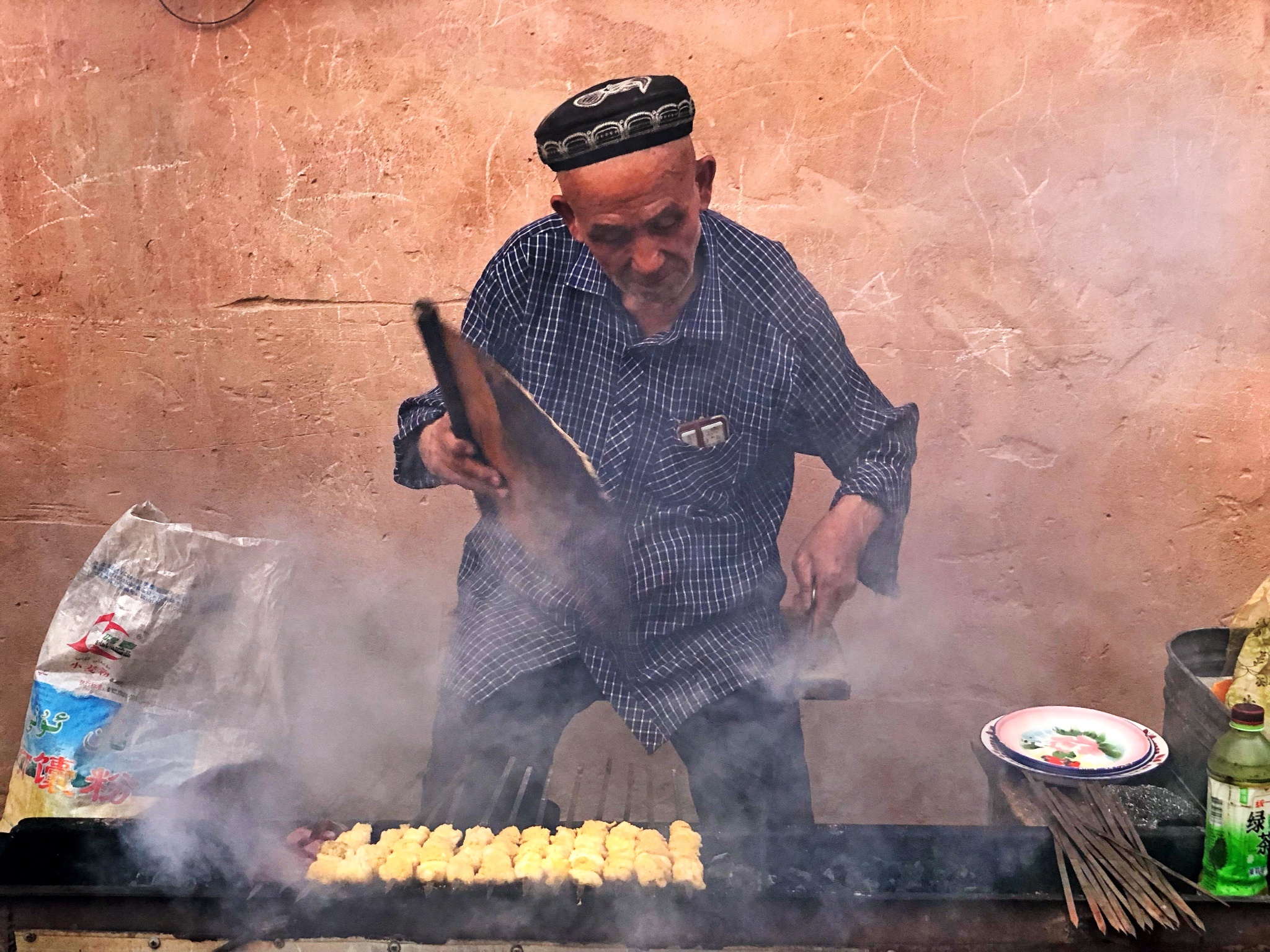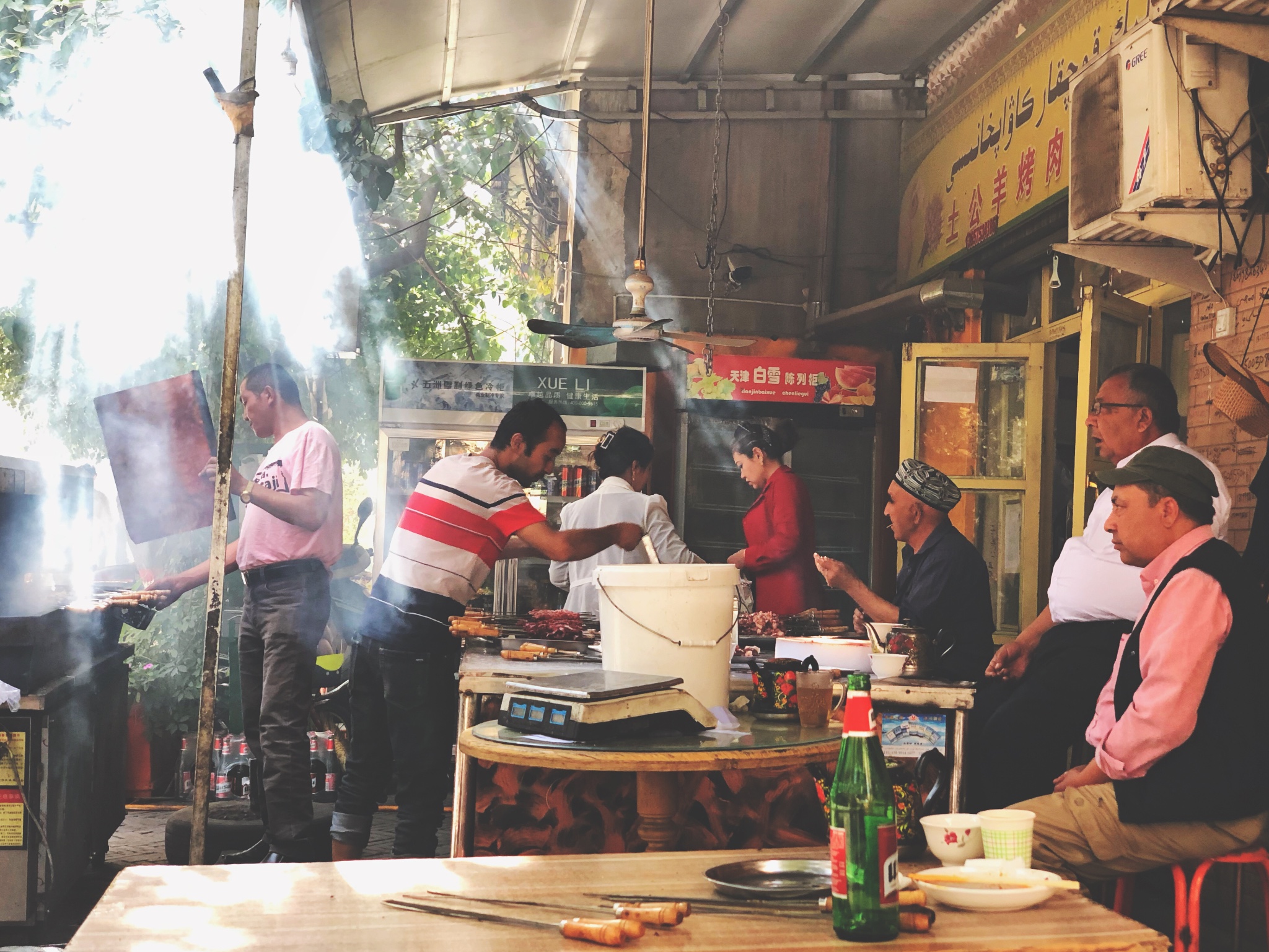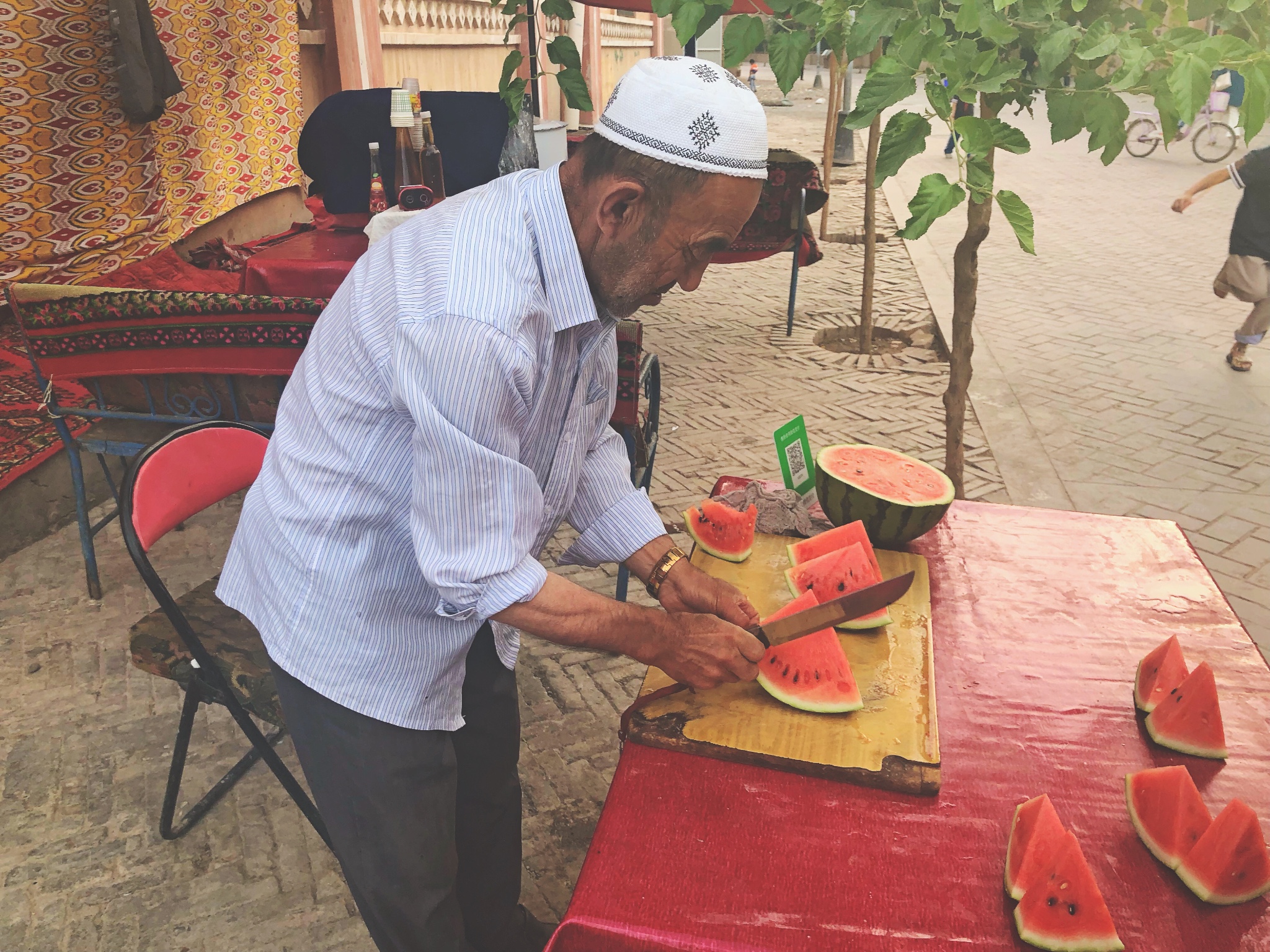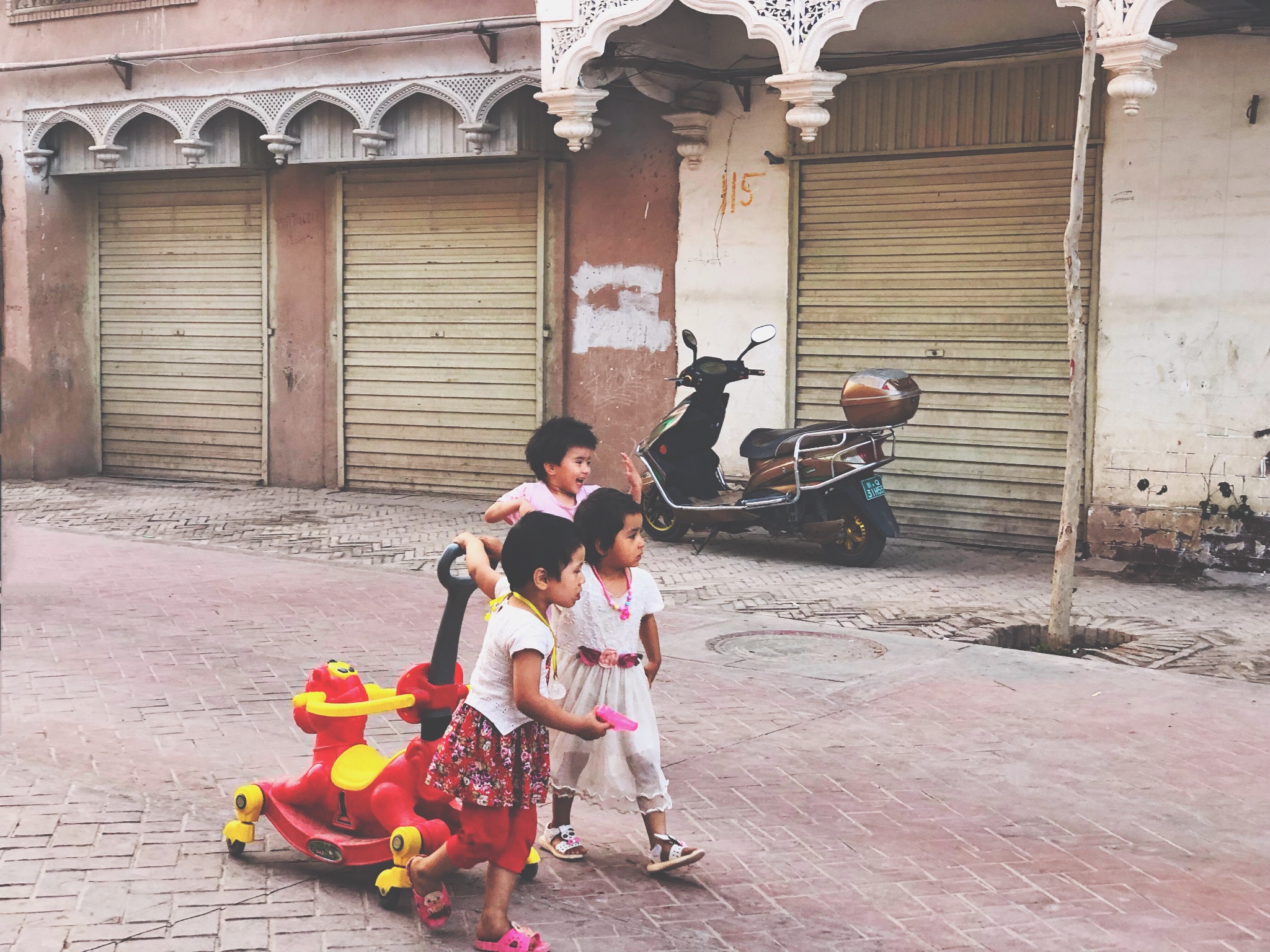 近几年的游玩经历中,确实去过一些“古镇”、“老城”。然而,有的“古镇”已经被翻修得没有了“古味”,与其说是古镇,不如说是走复古风的“ 新城 ”;有的“老城”确实存在了千百年,然而在各种“舶来品”的冲击下,商业化日趋严重,逐渐失去了原有的味道。但 喀什 老城不同,在我看来,这里的“卖点”并不只是它的“异域风情”,更是它尚未被外界过分打扰的生活状态。 黄土墙、花砖路、曲折迂回的巷子。历经风雨沧桑,这里依然保留着最朴素的面貌;烤馕店,老茶馆,各式各样的巴扎和作坊。千百年来,这里依然讲述着生活最珍贵的朴实 和平 静。 “余忆童稚时,能张目对日,明察秋毫,见藐小之物必细查其纹理,故时有物外之趣。”——《童趣》沈复 走在 喀什 老城,时不时有小朋友冲到面前对着我们大喊“你好”,这也许是他们汉语词汇量的极限。放了学的孩子们聚在一起游戏,没有手机也没有iPad;“坐在路边晒太阳”是这里生活的日常;三五好友,喝茶聊天,悠然自得。坐在广场上,看着眼前的一幕幕,思绪回旋。仿佛又看见了多年前阳光下互相踩影子的那群孩子;夏夜,侃大山的声音混着蝉鸣从巷口传来;哦对,我家的小白猫顺着香气溜到邻居家的院子,偷吃掉了一整盘黄瓜炒鸡蛋,这已经不是第一次了。 在一个不知名的巷口,被烤串的香气勾住了脚步。卖烤串的老爷爷颤巍巍地掏出身份证,指着出生日期那栏的“1940”,似乎是在告诉我们,时光的车轮滚滚向前,而这里依然保留着它原本的样子。