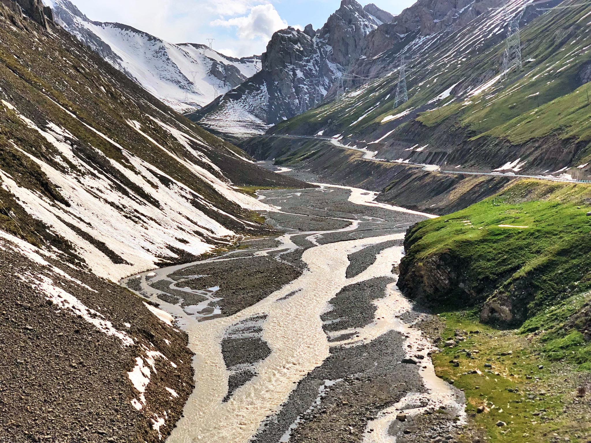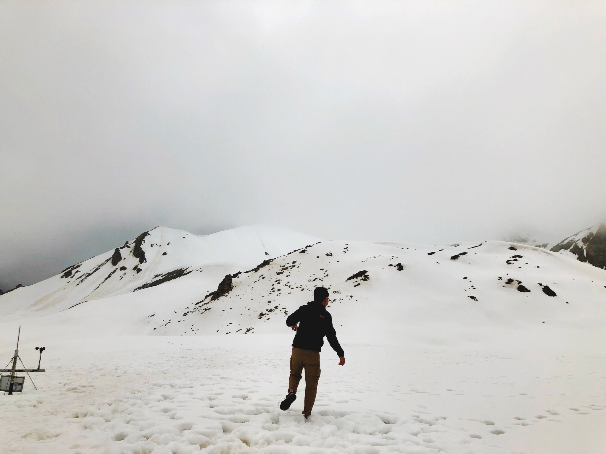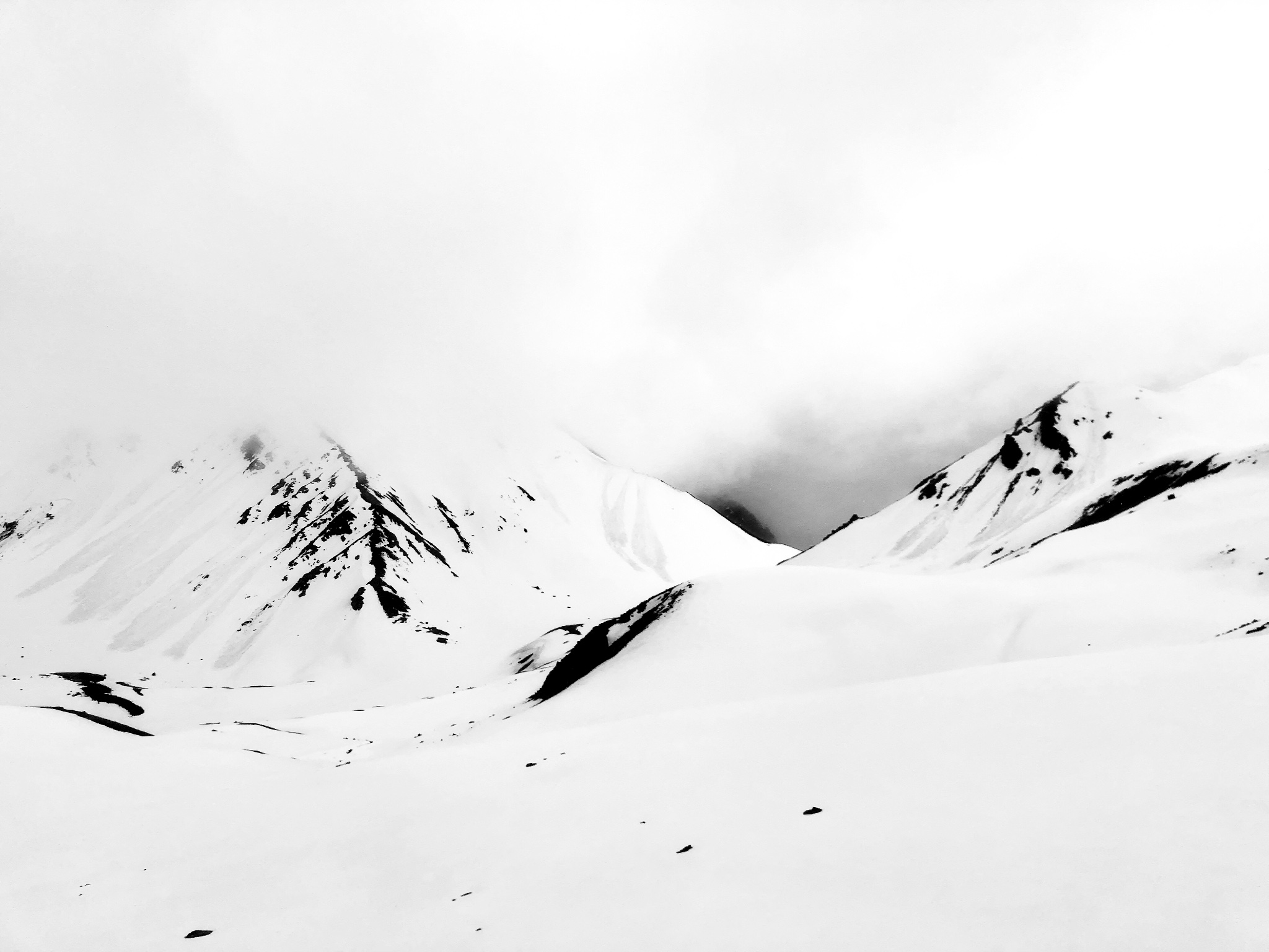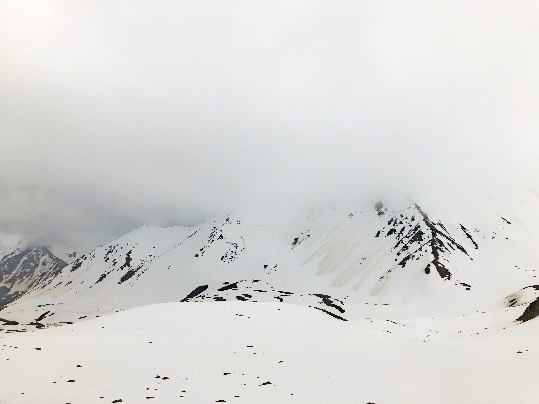 第二天出发后天气不太好,雾气笼罩下的山路,景色打了折扣,车子也要开得小心翼翼。同时不得不承认,在被各种艳丽的色彩狂轰滥炸之后,我们也有些意兴阑珊了。相对沉闷的气氛在车子开上哈希勒根达坂后消失殆尽,在这里我们终于可以亲临雪山,在雪地里面撒欢了!也终于补齐了 独库公路 上一年四季中的“冬”这块版图。