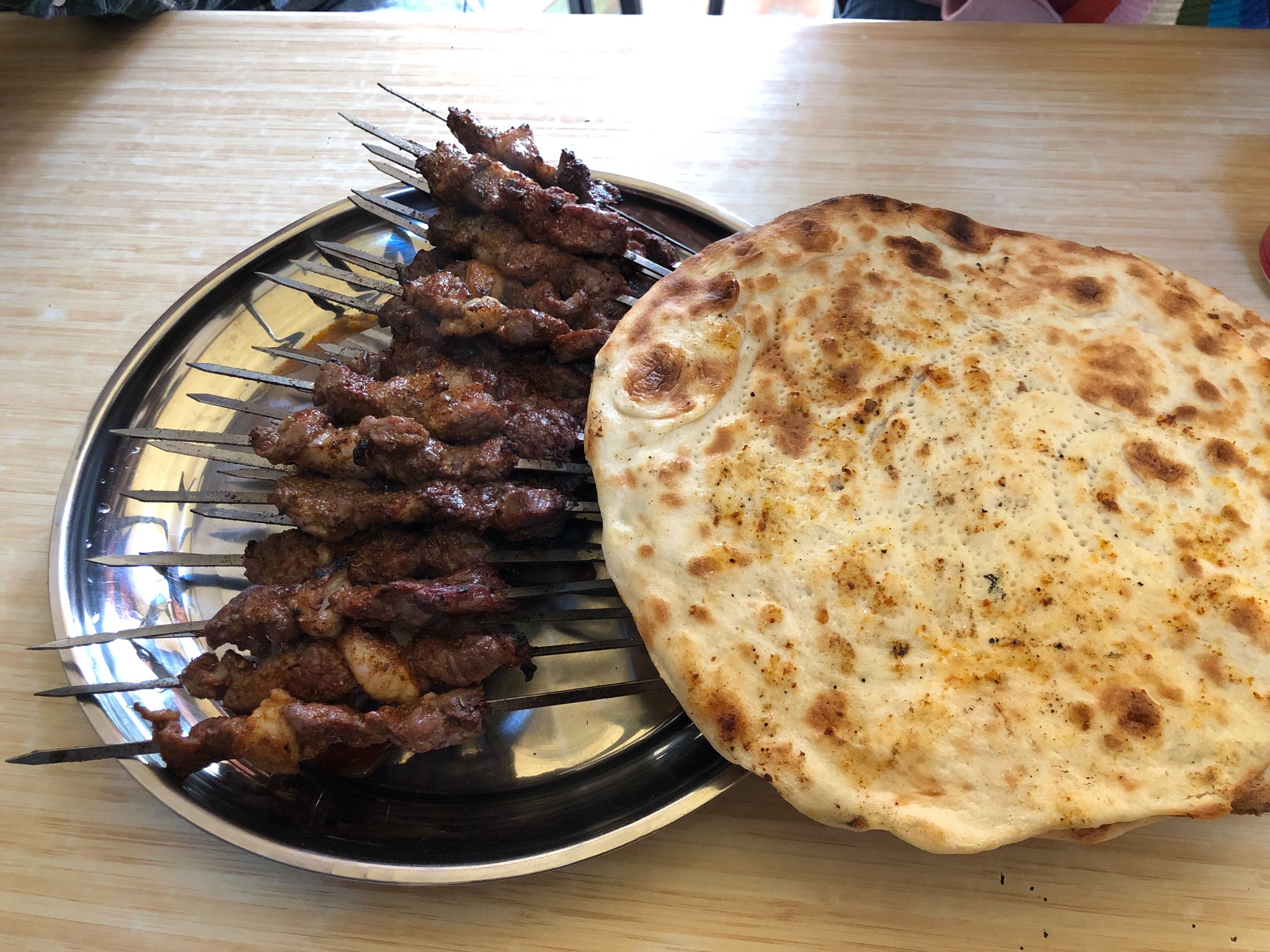 餐二: 羊肉火锅吃得太饱,以至于第二天起床后尚没有什么胃口,准备吃点清淡的……直到路边的一家烤串小店的香气飘来,就它了!在 新疆 不仅线路玩得野,胃口也越来越狂野,烤串、羊肝、腰子加烤馕,一顿“随便吃点”的早饭。看看旁边的本地人,一个烤馕卷上5、6串羊肉,塞进嘴里,大快朵颐。看着都很过瘾。单纯烤串的质量来说,这家店烤的肉串相对较小,相对于在其他地方吃到大串,更容易入味。加分! 这顿饭是馒头小哥哥在整个 新疆 行程中所有餐食的No.1。