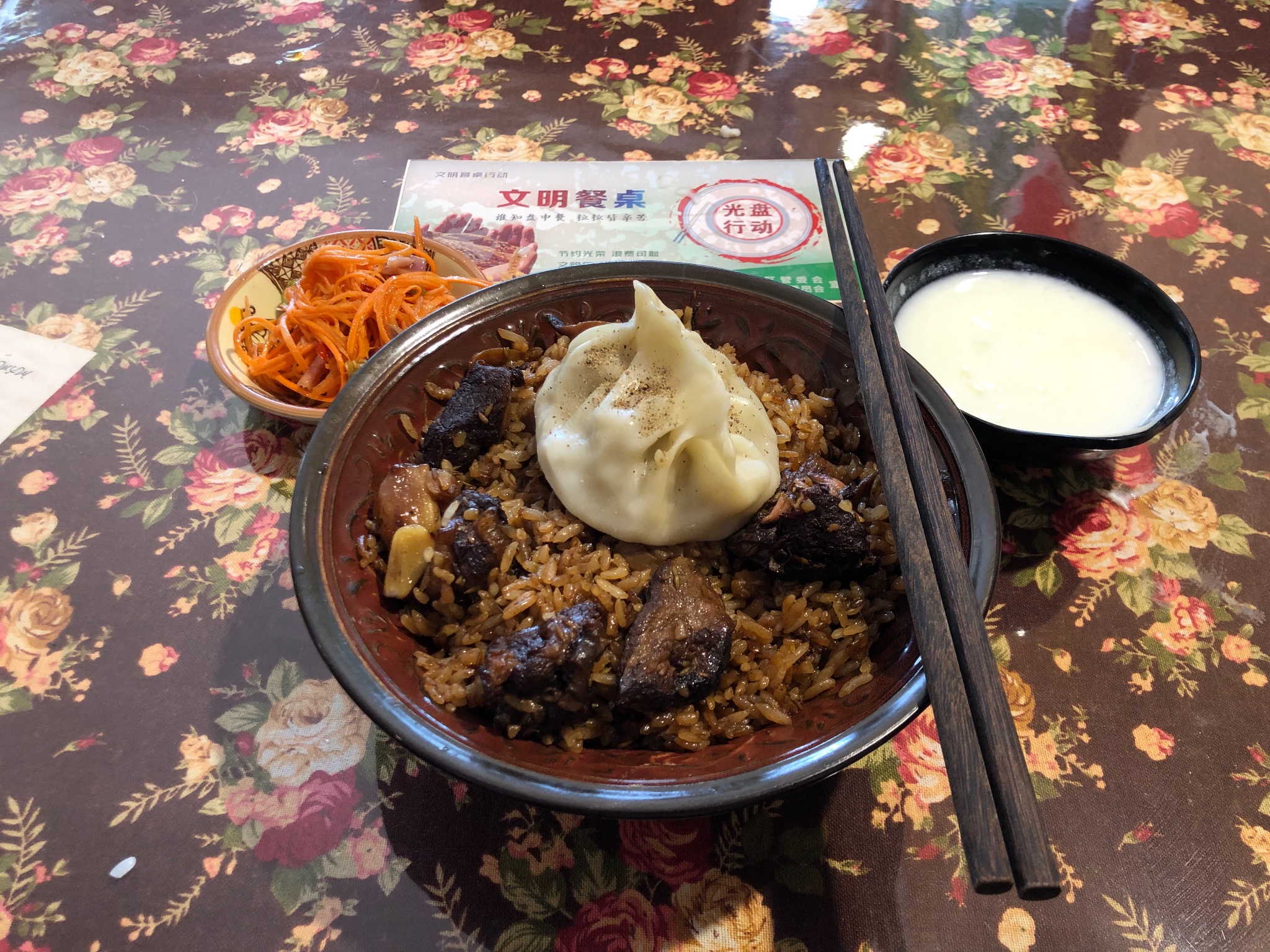 下图是马小麦抓饭,特色黑抓饭,赠送酸奶和小菜,另点一个薄皮包子,美!