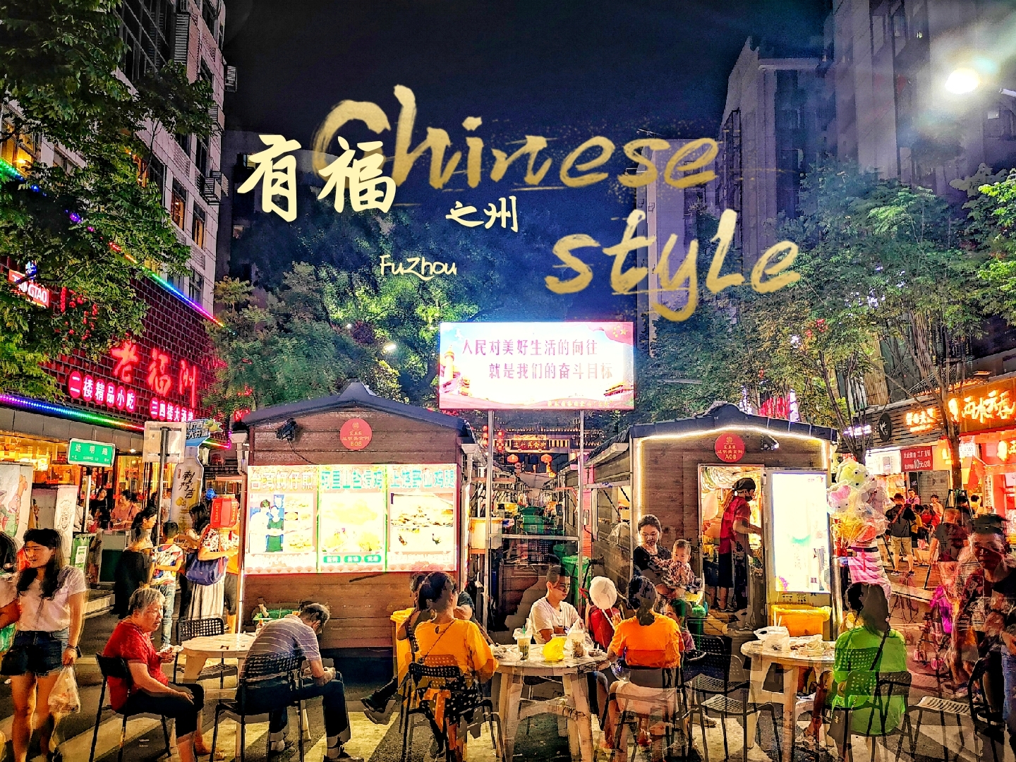 下图中,“人民对美好生活的向往就是我们的奋斗目标”,这块牌子树立在此,大概可以理解为“吃货们对美食的向往就是我们美食街的奋斗目标”!