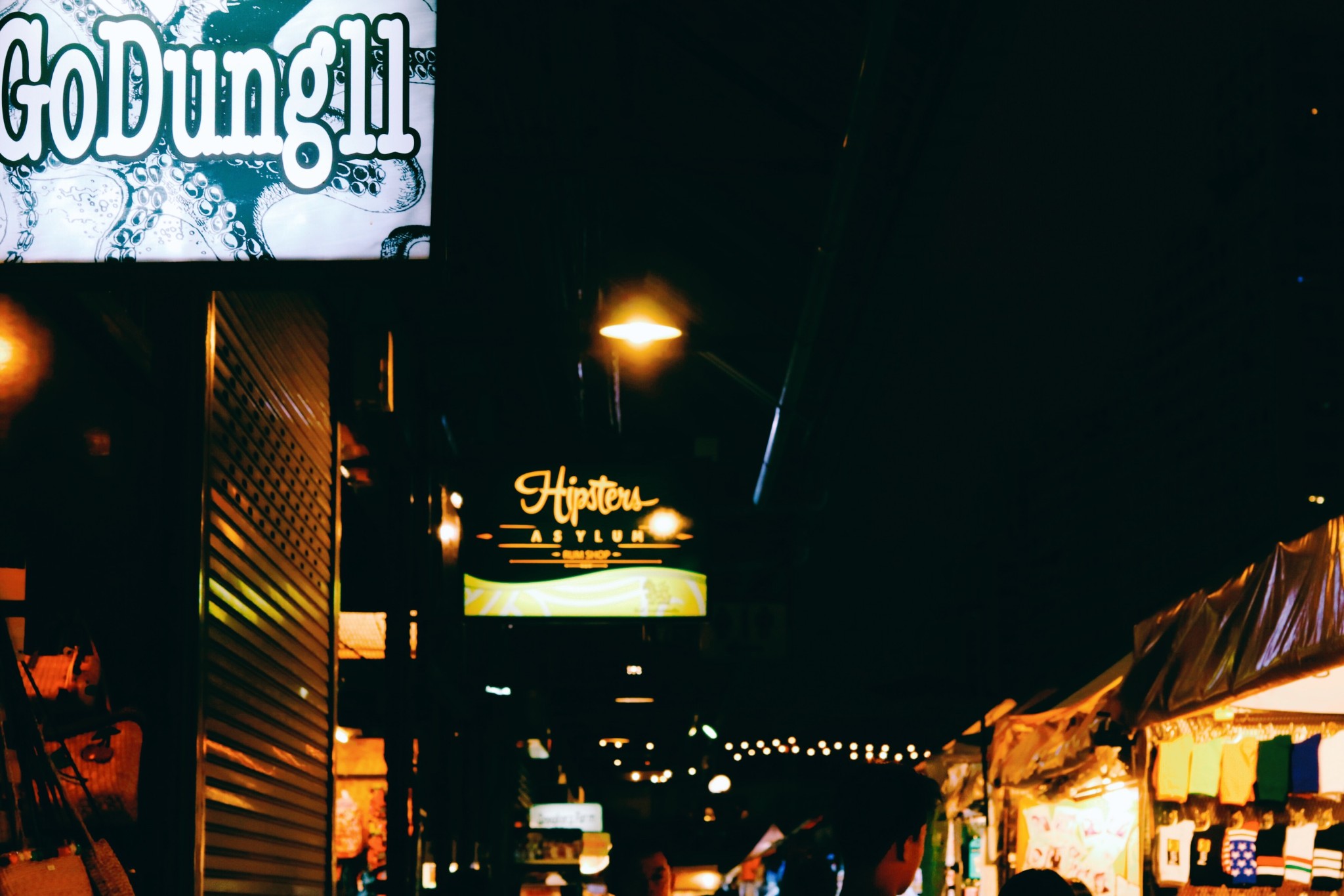 夜市分了四边 一边是酒吧一条街 一边是服饰和小饰品 另外两边是美食摊位 酒吧的生意似乎并不好,零零散散 音乐声很大,但也撑不起热闹