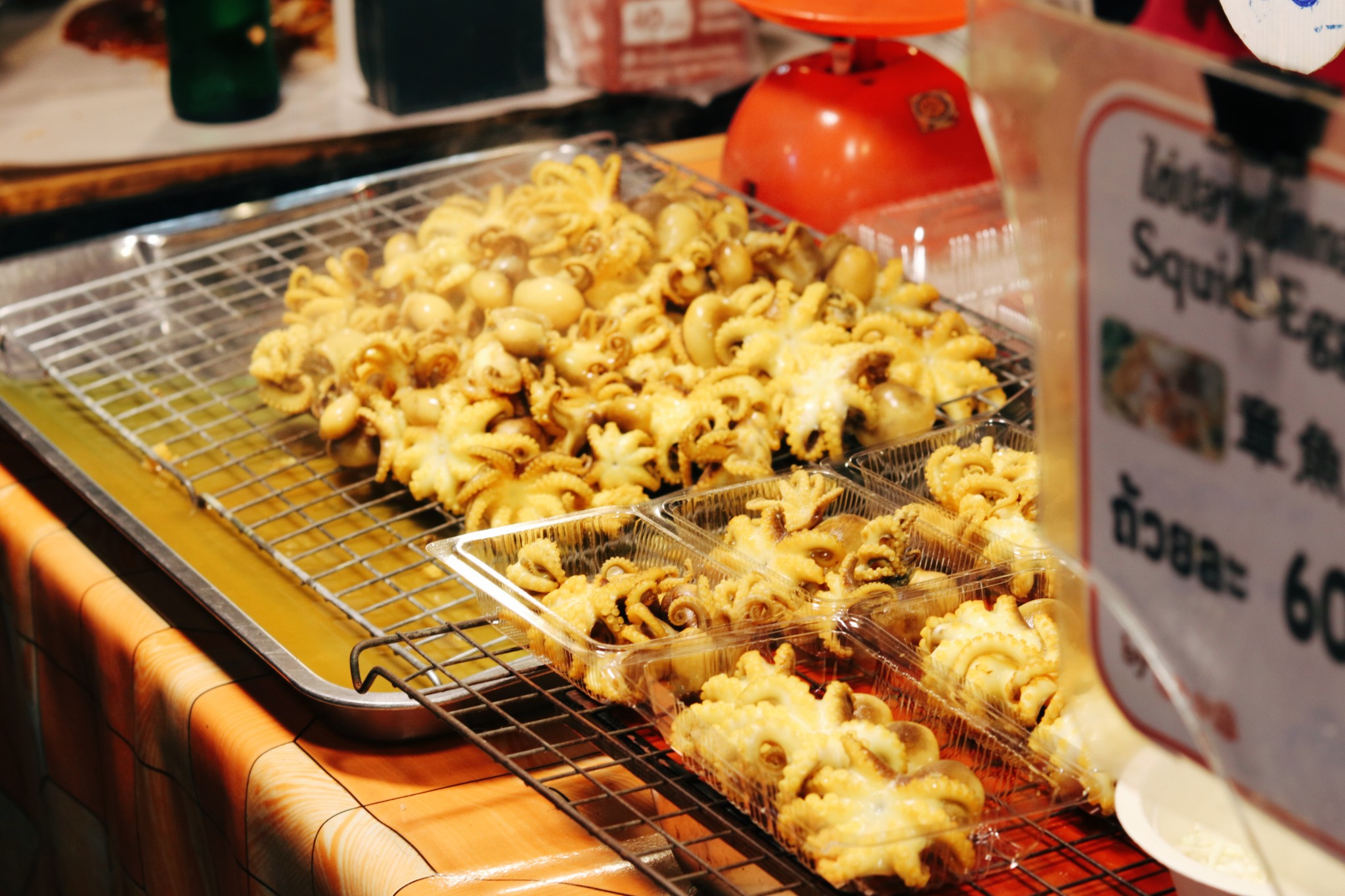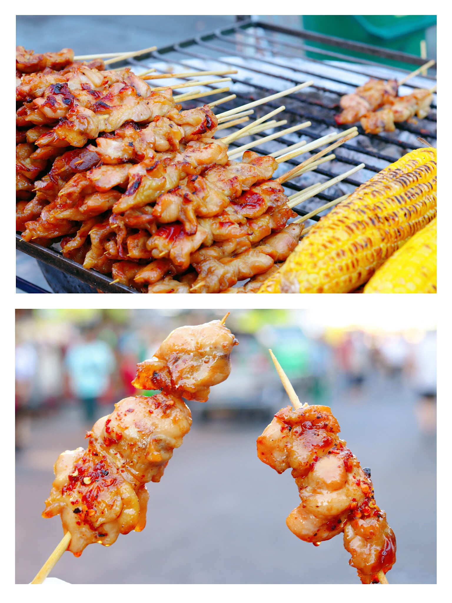 街边上,各种小食品 我对街边小吃一向不敢尝试,但这里摆出来的食物外观就像是有魔力一样,让人忍不住诱惑。 说服了自己,说服了朋友,就放了自我 两串烤鸡肉,一口咬下 “天啦,太好吃”