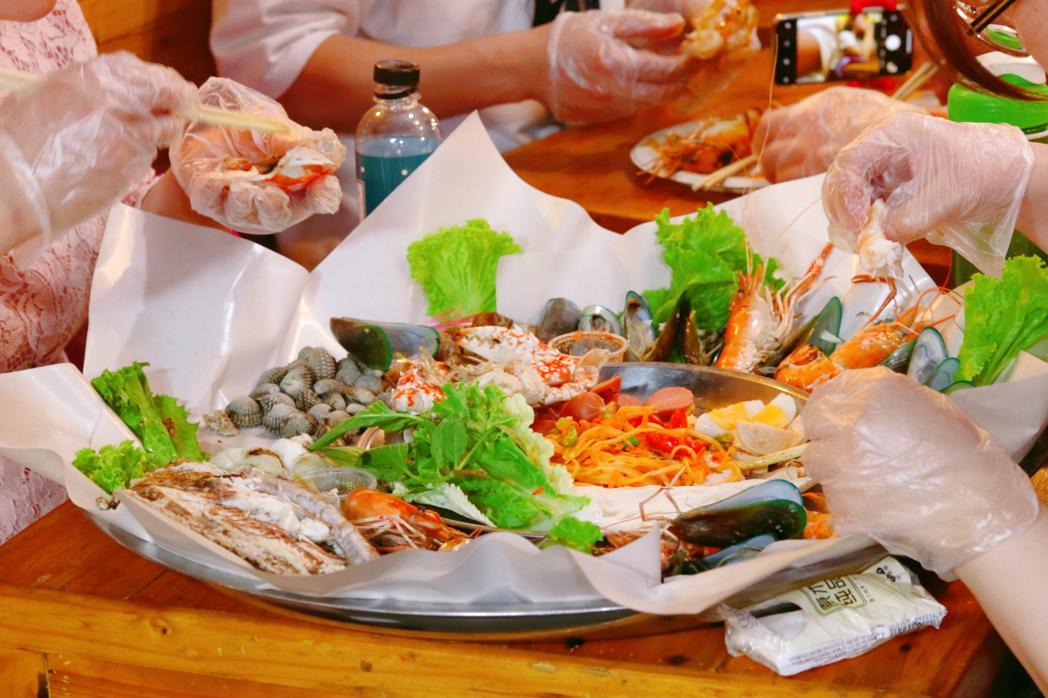 一份份海鲜看着还是能让人垂涎欲滴 肚子太饱,没有尝试 游人们倒是吃得甚是欢乐