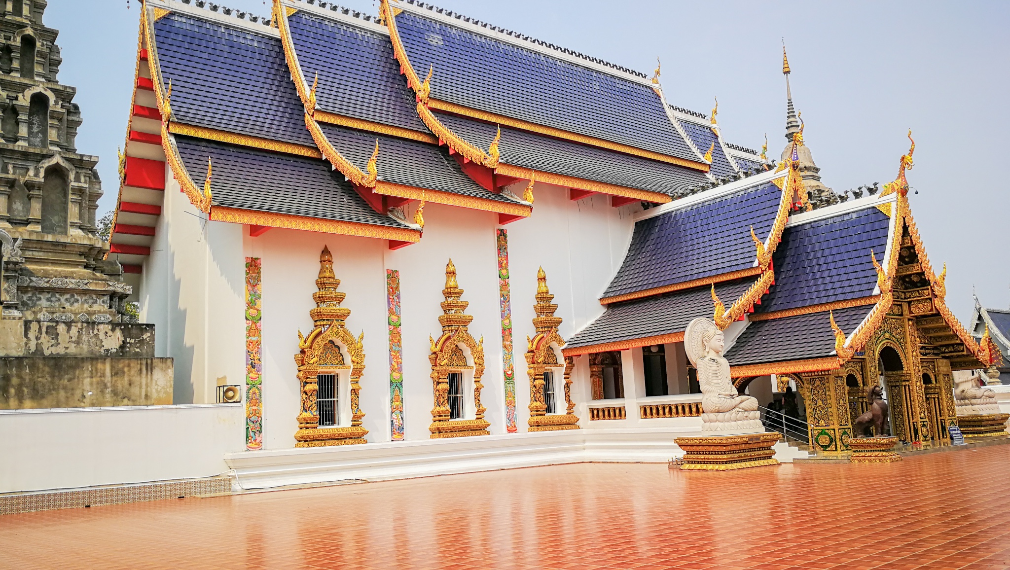 👣 清迈 蓝庙,跟 清莱 蓝庙不同,后者名气比较大,因为后者大部分建筑都是蓝色的,而 清迈 这个位于 湄登 县的庙五颜六色都有,看起来没那么统一,但是色彩运用也是挺妙的,看起来很新,应该是翻新过不久。 清迈 蓝庙 Wat Ban Den,位于 清迈 北部40公里左右的 Mae Daeng 郊区,是一座有着百年历史的古庙,规模宏大。始建于公元1894年,是一座非常有故事的寺庙,而且目前还在扩建中。蓝庙最开始默默无闻,直到1991年泰北得道高僧 古巴 昭腾路过此地并落脚于此,信徒们纷纷前来膜拜并捐献财物。随着捐献的财物越来越多, 古巴 昭腾决定把这些钱用来建设寺庙。这才使得蓝庙成为如今 清迈 最大的寺庙之一。
