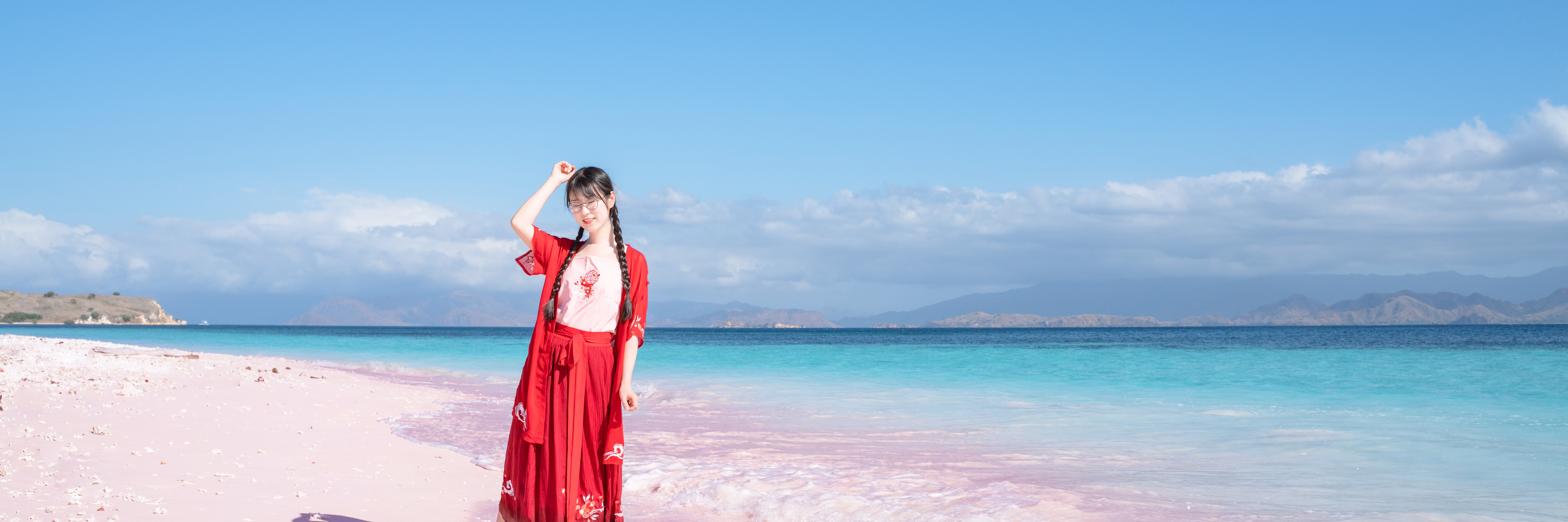 粉色沙滩被海水浸湿的部分是最粉的,当纯洁的粉与干净透澈的蓝相接,这样的色彩着实太戳心。 那是一种只看着就觉得无比美好的喜悦,没有任何其他原因,只因身处当下,只因眼前的美妙。 这世间的浪漫啊,你是。 我在沙滩上蹦蹦跳跳起来,琦琦卖力的给我拍着照片,我俩偶尔会互相diss一番,但大多数时候他都是极顺着我的,我说拍张这样的,拍张那样的,他用很多个被我嘲笑的诡异姿势为我拍下了喜欢的相片。 如影随形,大概就是这样,我理所应当的相信着无论到哪里他都会陪着我,这是他给我的最珍贵的安全感。