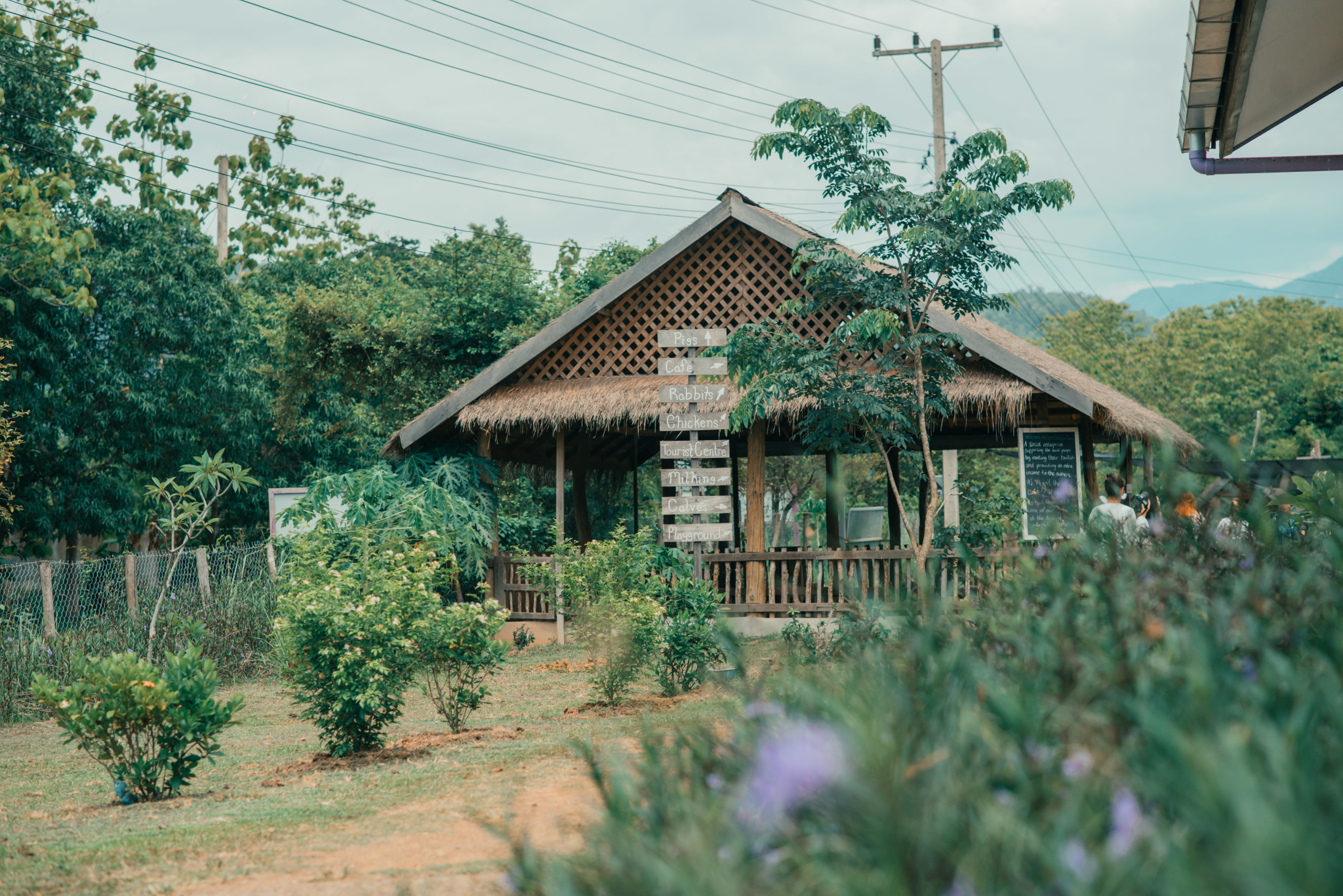 农场突然来了一阵雷雨, 琅勃拉邦 的空气一下子变得凉爽了起来,我们坐在凉亭中吃着东西休息赏雨,赞呢。