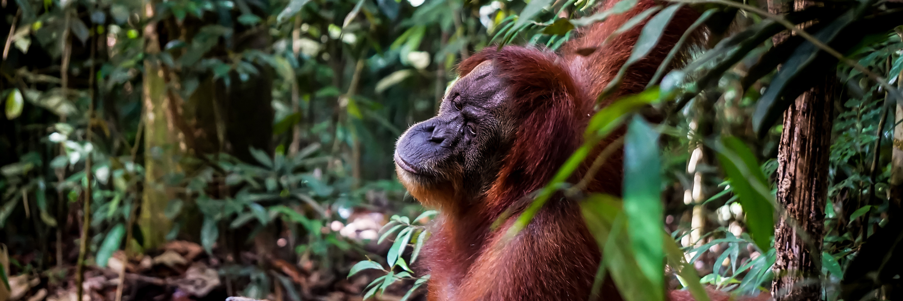 Fig 27. Gangster monkey 雄性一枚,算是这一窝猴子的老大,神态确实沉稳。不过动物界的竞争总是很残酷的,一旦他被新的公猴子打败,就必须要离开现在所属的猴群,基本上也就等于被判处死刑了。 路上Jipur从地上捡了一根孔雀草,在手里碾碎给秋儿阿姨的被叮的手指敷上,一会儿果然止疼止痒,神奇。前方忽然聚集了许多人,原来是附近有一只红毛猩猩出没。 猩猩的体型接近于人,红色毛发在林子里非常惹眼,看来在林子里应该是没什么天敌,都不需要刻意隐藏自己。上个世纪流行研究猩猩的智力,以高智商著称的红毛们也因此成为了权贵们家中流行的宠物,传说因为大家都想要幼年小猩猩,而红毛猩猩在成年前母子难以分离,所以走私犯经常需要配合猎手,射杀母猩猩,获取小猩猩,非常残忍。至于红毛同学的智力,Chantek的故事流传甚广,可自行谷歌百度。