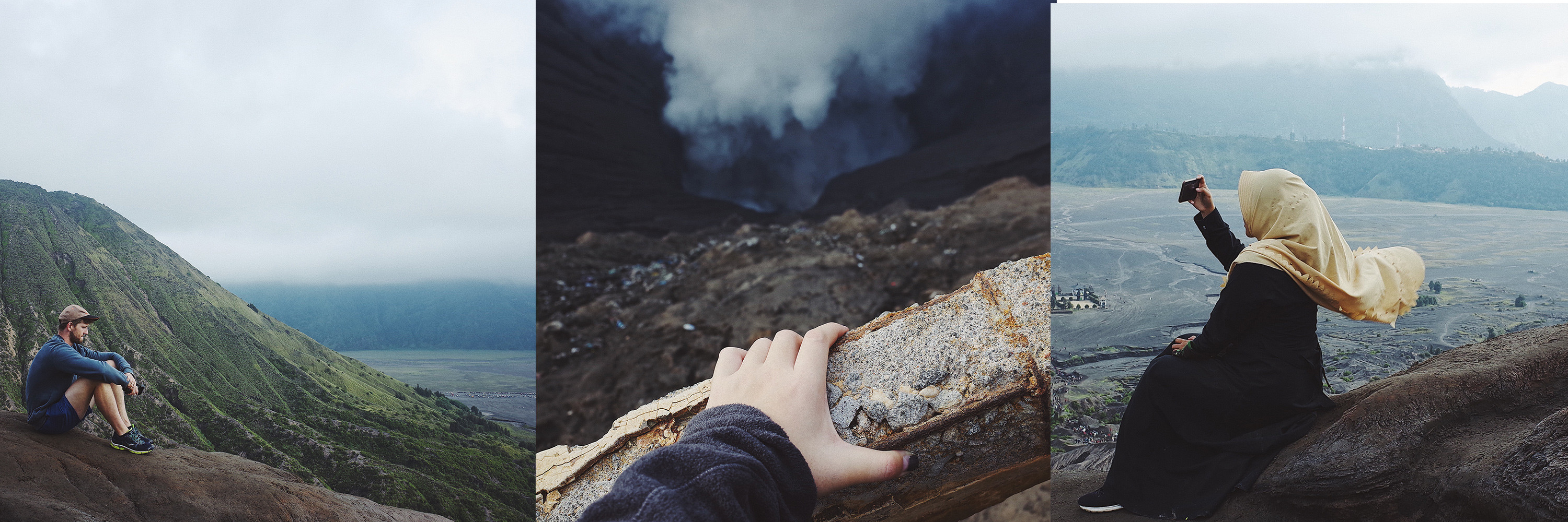 沿着接近九十度的阶梯往上爬 登顶那一刻就是站在火山口了 感慨大自然奇妙之时 滚滚浓烟立马飘过来 浓厚的硫磺味熏得睁不开眼